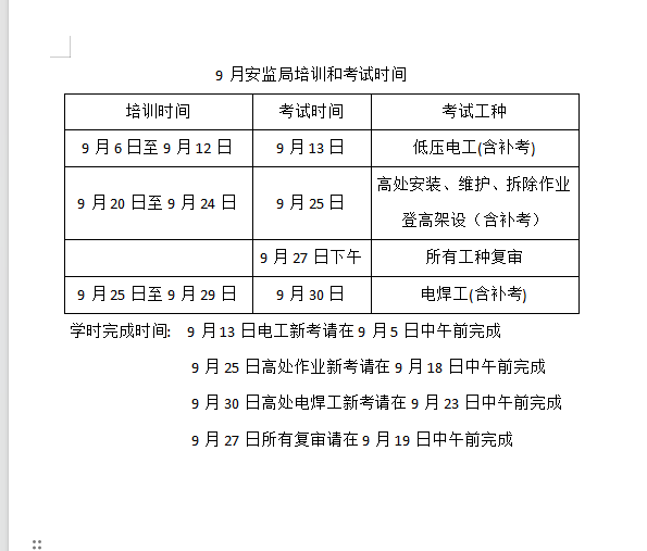 9月份电工证考试通知: